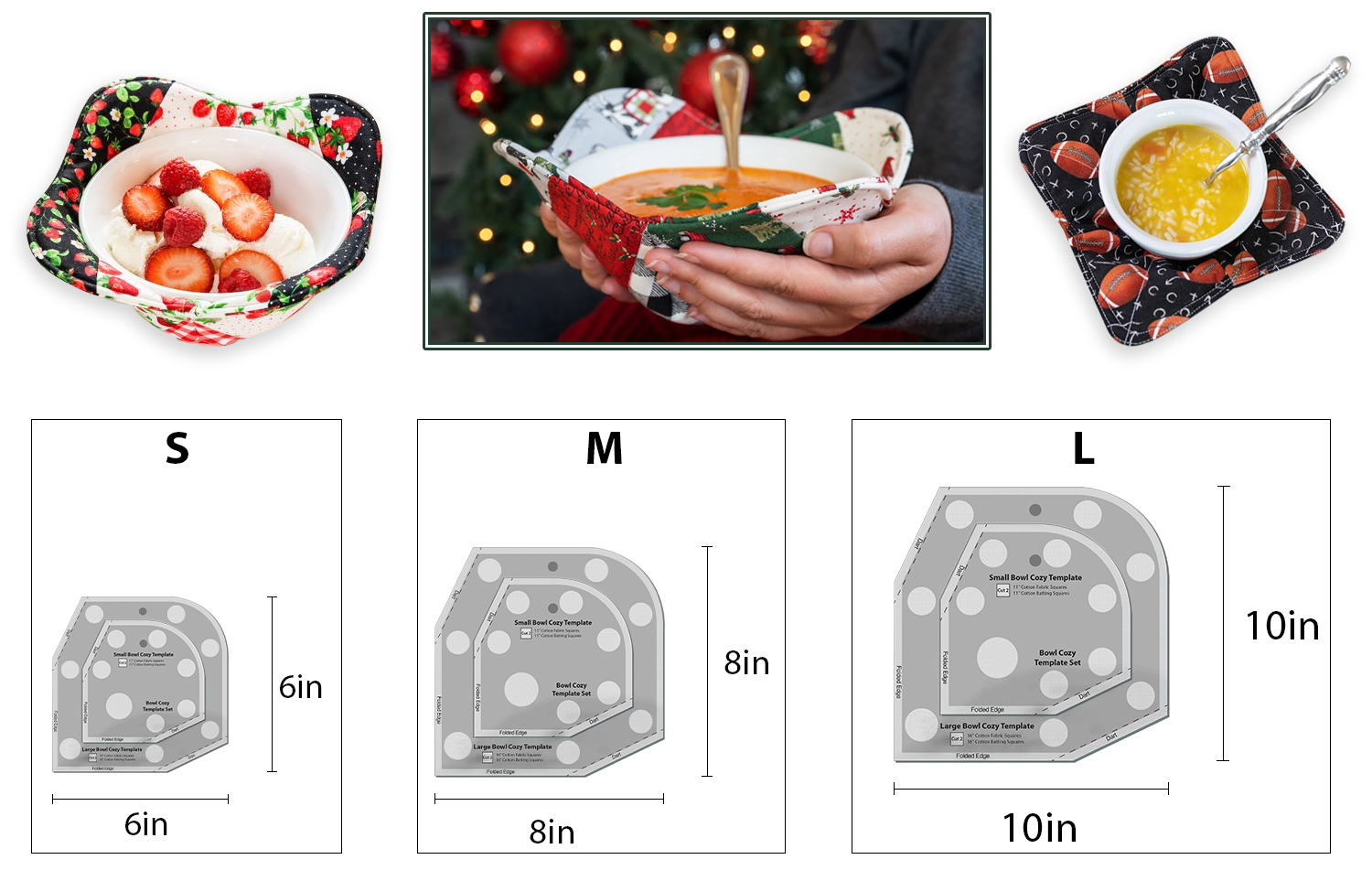 This nested set includes three sizes of bowls. (Cut 6" 、8" 、10"Cotton Squares) The small bowl cozy template works with the precut bowl cozy batting, the other template with the large . If you prefer to cut your own batting, we recommend cotton batting which is microwave safe.