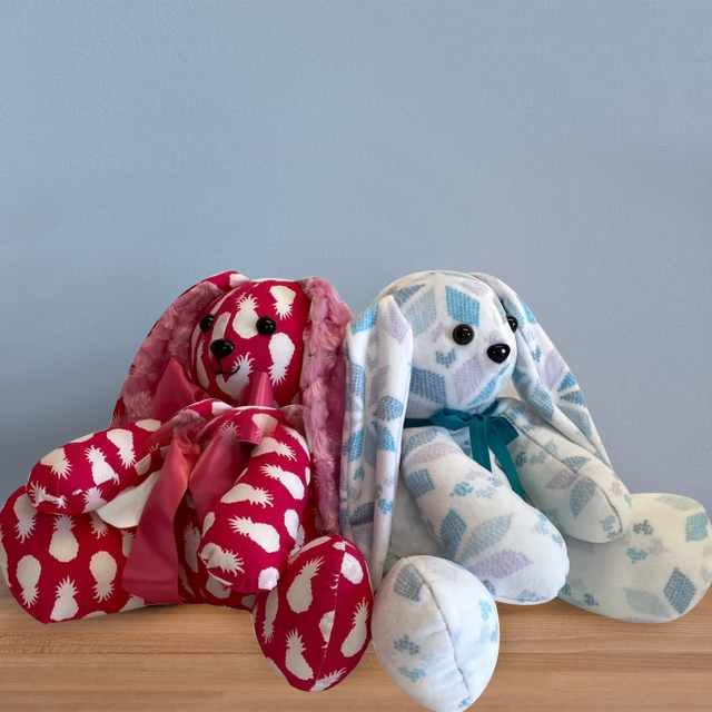 Memory Bunny made from the clothing of a loved one who passed to help keep their memory alive. Can also be made from a child’s clothing to preserve their childhood memories. *Hand made using a huggable patterns pattern.