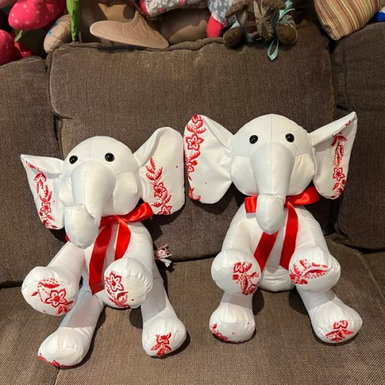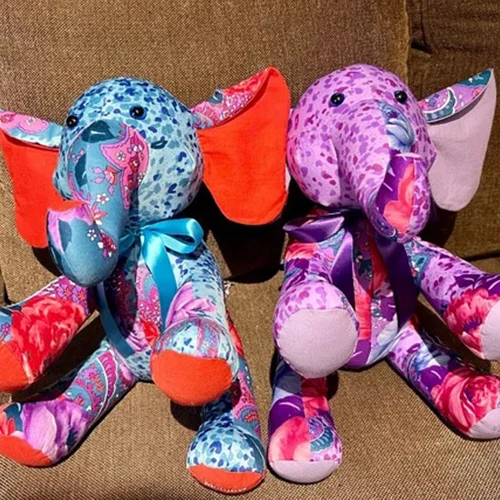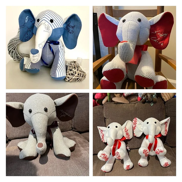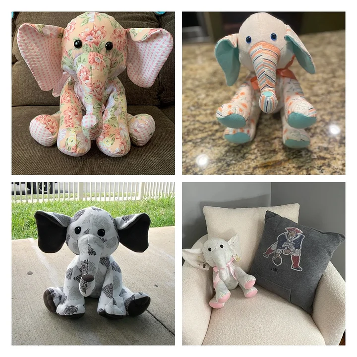 Memory Elephant made from the clothing of a loved one who passed to help keep their memory alive. Can also be made from a child’s clothing to preserve their childhood memories. *Hand made using a huggable patterns pattern.
