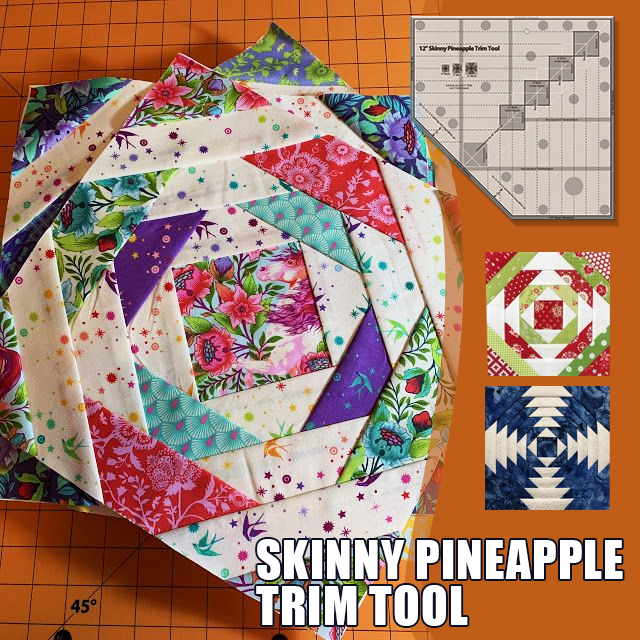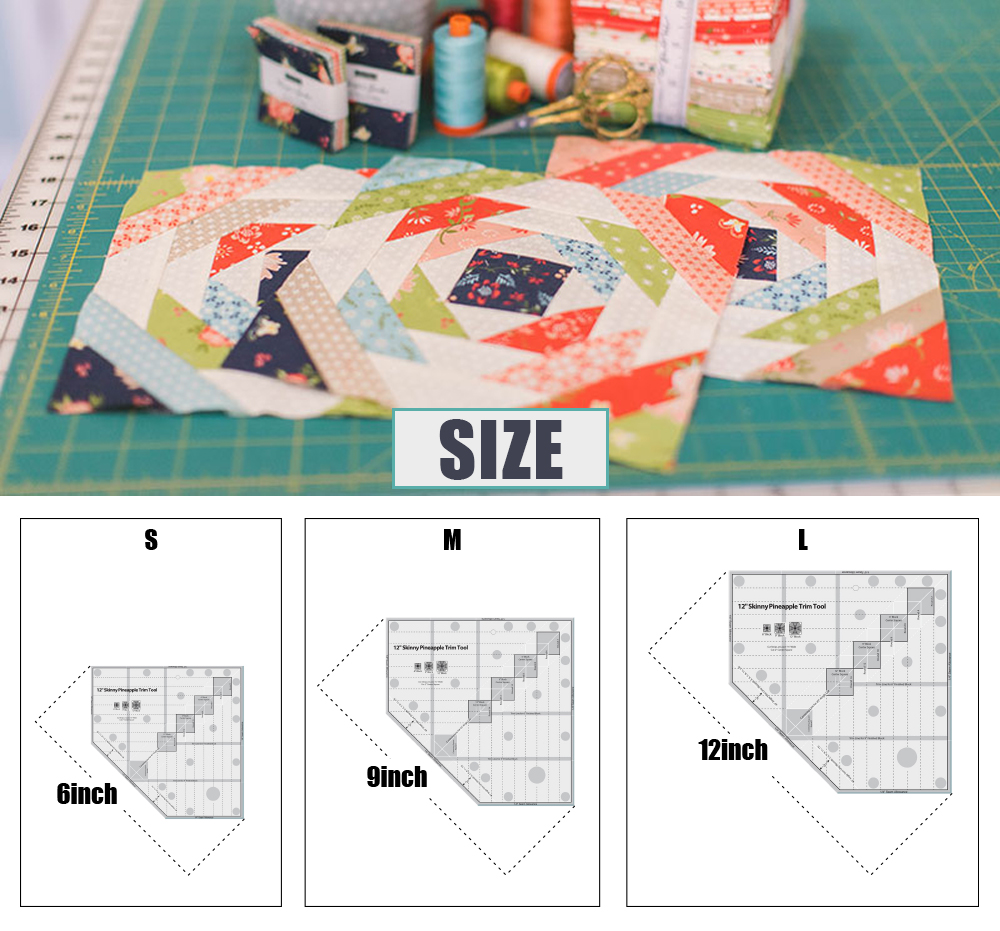 Create perfect 6", 9", or 12" finished Pineapple blocks by squaring up each round of strips as they are sewn. Since each round is squared up before the next set is added, the blocks are perfectly square. The cutting requirements for the strips and center square are printed right on the tool.
